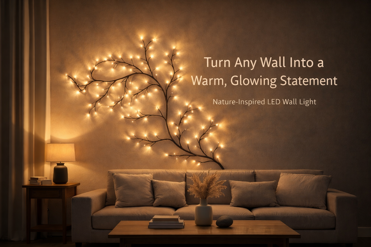 Each slender branch flows organically, holding tiny warm white LED lights that glow gently in the evening, turning ordinary walls into inviting, cozy spaces. During the day, its minimalist branch silhouette blends effortlessly with modern interiors. At night, it comes alive—casting soft shadows and a golden ambiance that instantly changes the mood of the room.
